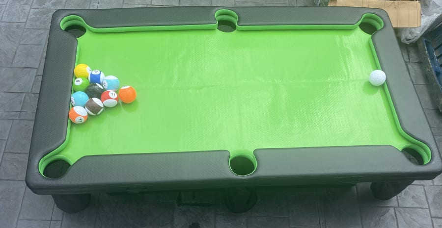 This oversized pool table is a high pressure rigid sealed inflatable rather than being soft like a bouncy castle with matching oversized balls. Remember to allow some additional space around the table for players to stand and take their shots.