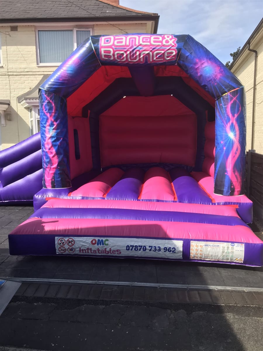 OMC Inflatables are proud to offer you this Dance n Bounce bouncy castle with a slide, ready to be hired throughout the North West of England including Manchester, Stockport, Oldham, Wigan, Rochdale, Salford, Warrington, Leigh,Cheshire.