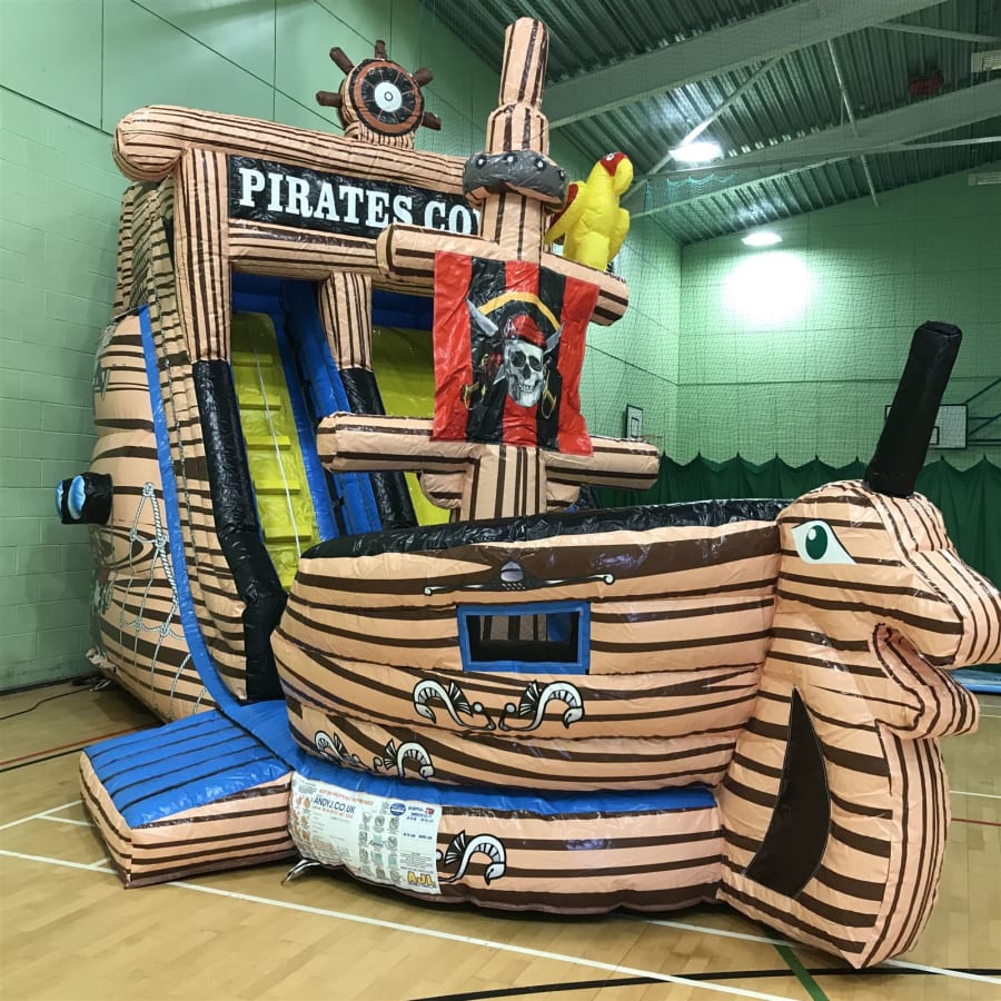 What a brilliant eye catching slide you could have at your party! This is the real treasure, a unique an endless fun bringing inflatable bouncy slide in a fantastic pirate ship theme with incredible 3D inflatable features such as the steering wheel at the top, the mast, the inflatable parrot and the brilliant inflated shaping at the front of the ship!